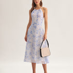 Clarice - Midi Kék Virágmintás Ruha Halter Nyakkivágással